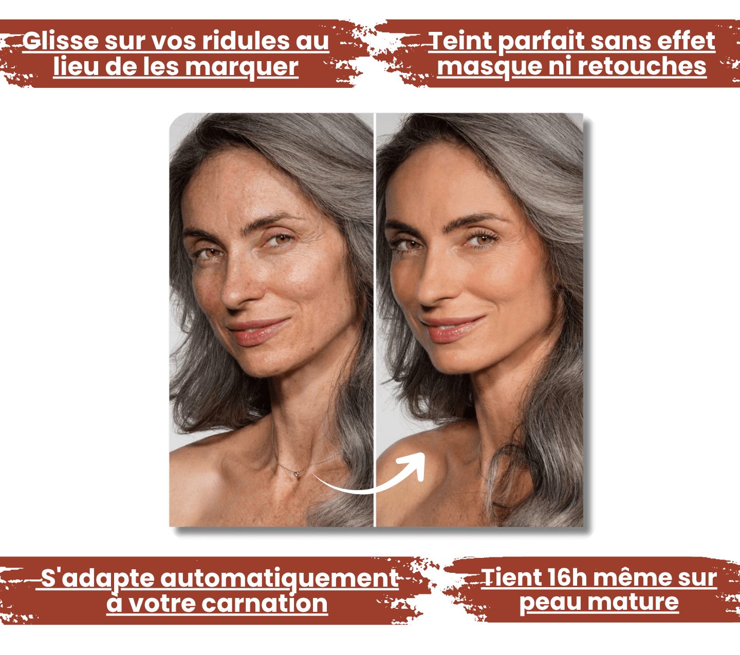 Oui. Notre technologie ne "remplit" pas vos rides, elle glisse dessus sans s'y loger. Les rides profondes (front, pattes d'oie, sillon naso-labial) sont visiblement atténuées dès l'application. Pour un effet optimal sur les rides marquées, appliquez 2 fines couches plutôt qu'une épaisse.